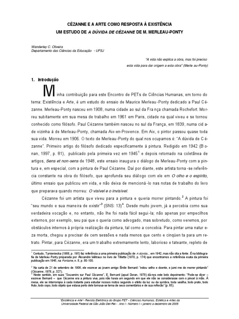 tema: Existncia e Arte, um estudo do ensaio de Maurice Merleau -Ponty dedicado a Paul Czanne. Merleau-Ponty nasceu em 1908, numa cidade ao sul da Fra na chamada Rochefort. Mo rreu subitamente em sua mesa de trabalho em 1961 em Paris, cidade na qual viveu e se tornou
