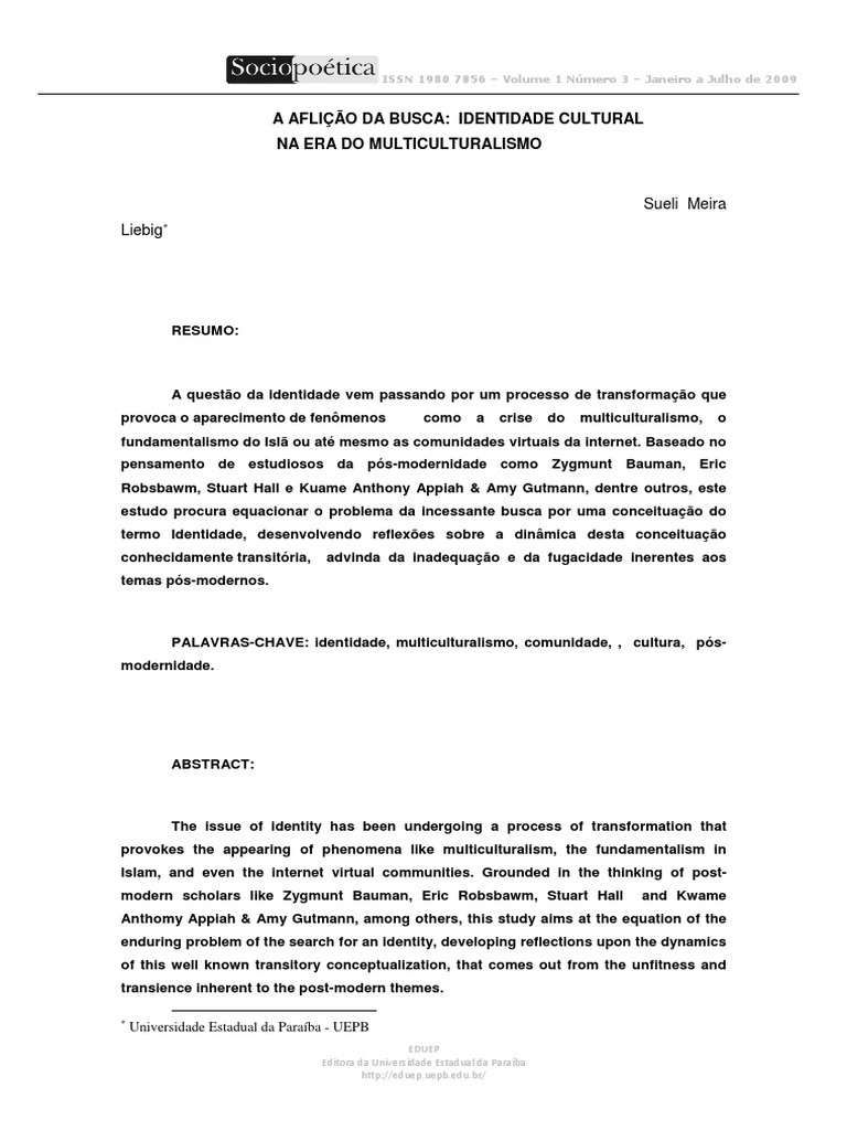 PALAVRAS-CHAVE: identidade, multiculturalismo, comunidade, , cultura, psmodernidade.