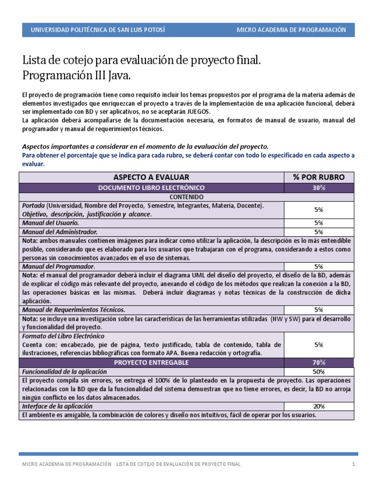 MICRO ACADEMIA DE PROGRAMACIN LISTA DE COTEJO DE EVALUACIN DE PROYECTO FINAL