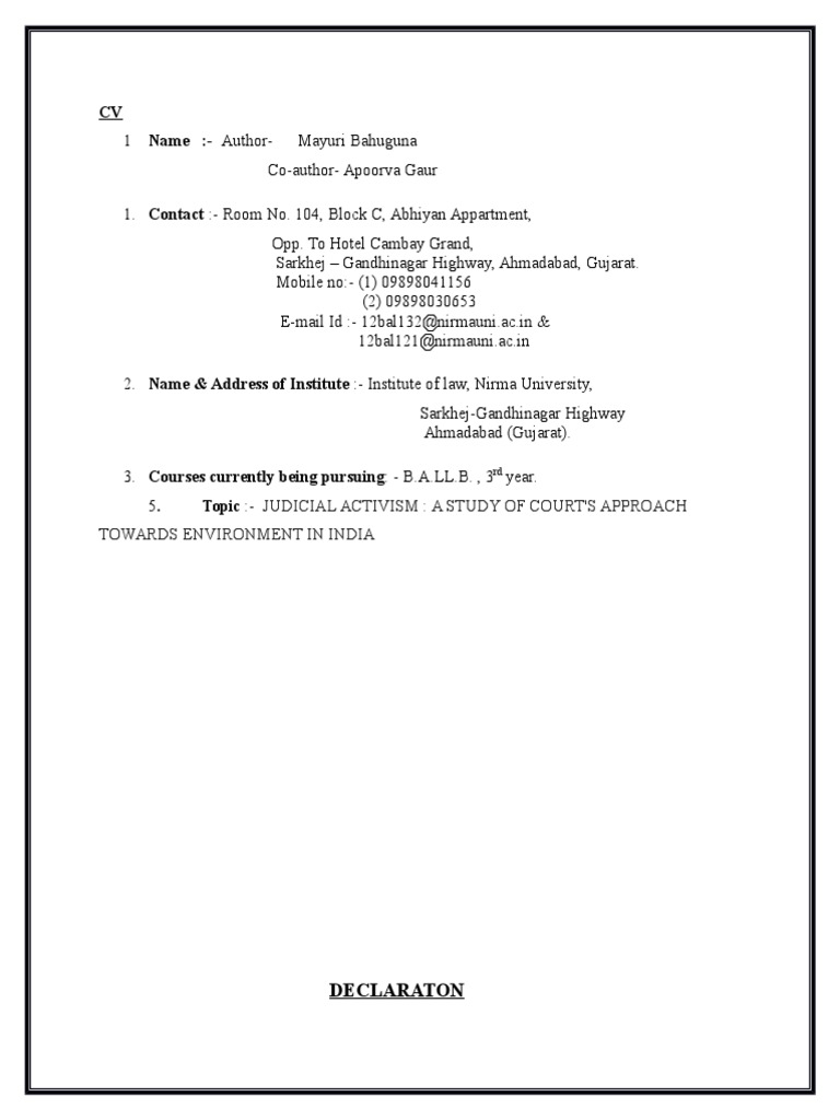 We hereby declare that the researched title JUDICIAL ACTIVISM: A STUDY OF COURT'S