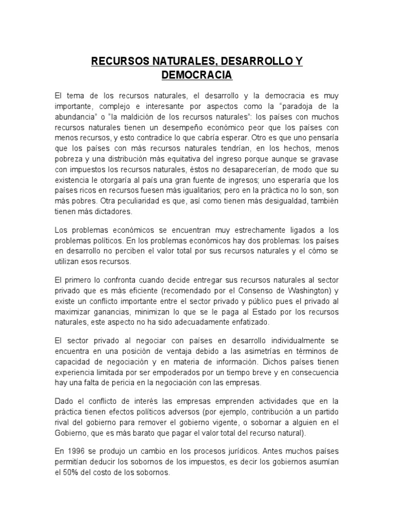 El tema de los recursos naturales, el desarrollo y la democracia es muy