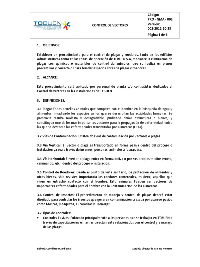 3.6 Control de Insectos: El procedimiento de manejo y control de plagas deber estar