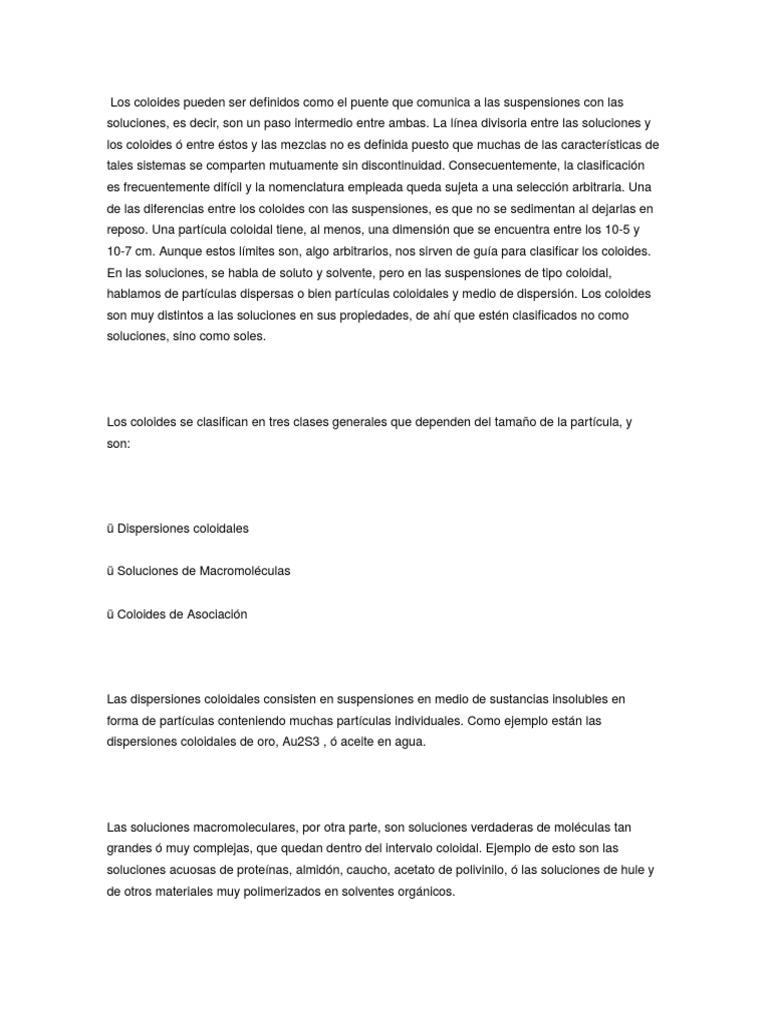 Los coloides se clasifican en tres clases generales que dependen del tamao de la partcula, y