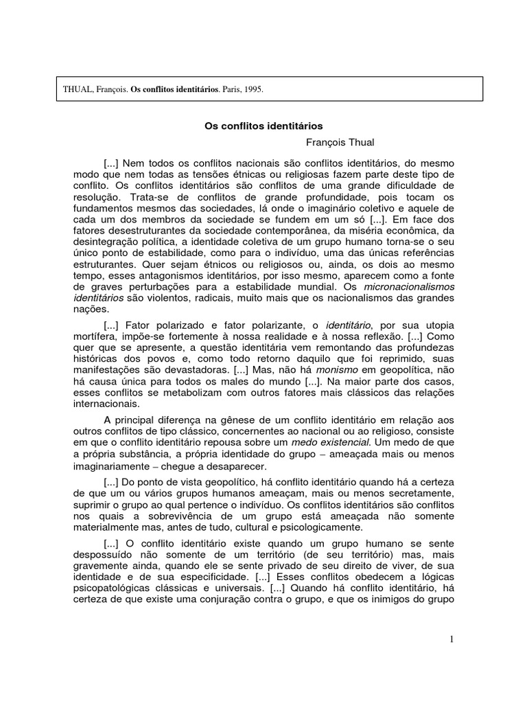conflito. Os conflitos identitrios so conflitos de uma grande dificuldade de