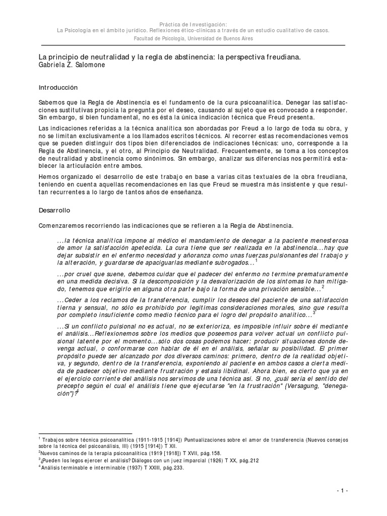 En varias de las citas textuales que transcribimos aqu puede notarse que Freud dej entrever las dificultades que conlleva la indicacin de neutralidad. Veamos dos ejemplos.