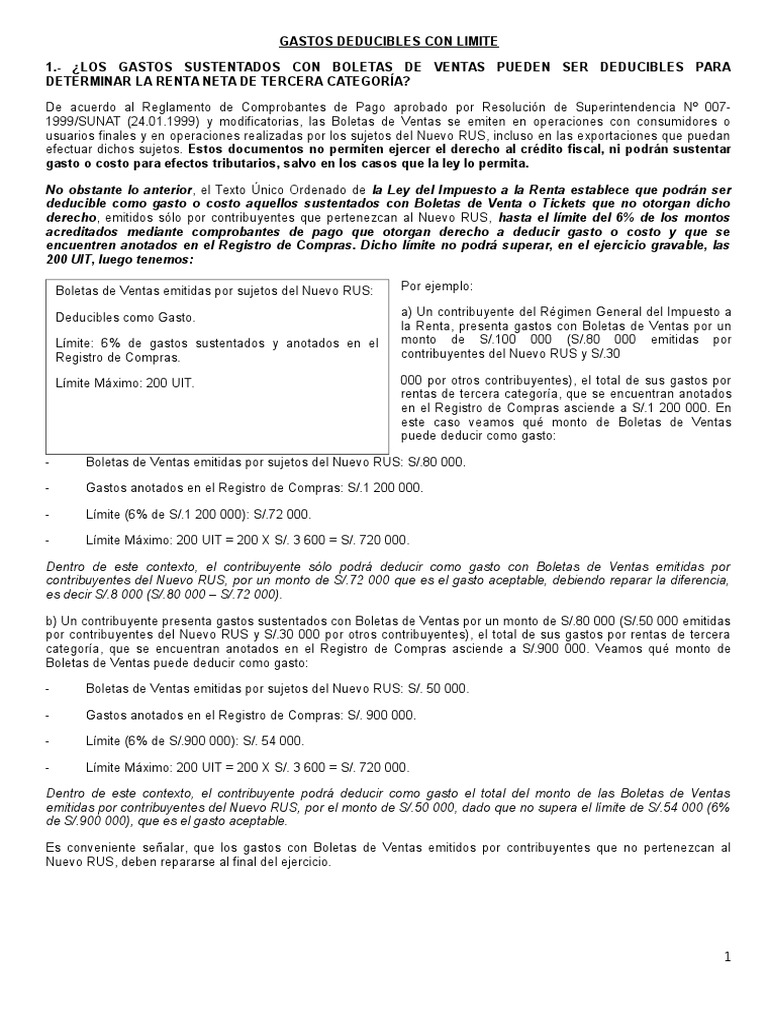 Es conveniente sealar, que los gastos con Boletas de Ventas emitidos por contribuyentes que no pertenezcan al