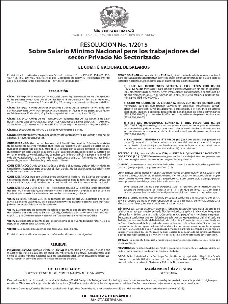 VISTA: La Resolucin No. 2/2013, de fecha 03 de julio del ao 2013, dictada por el Comit Nacional de Salarios, que fija el salario mnimo de carcter nacional para los trabajadores del sector Privado No Sectorizado.