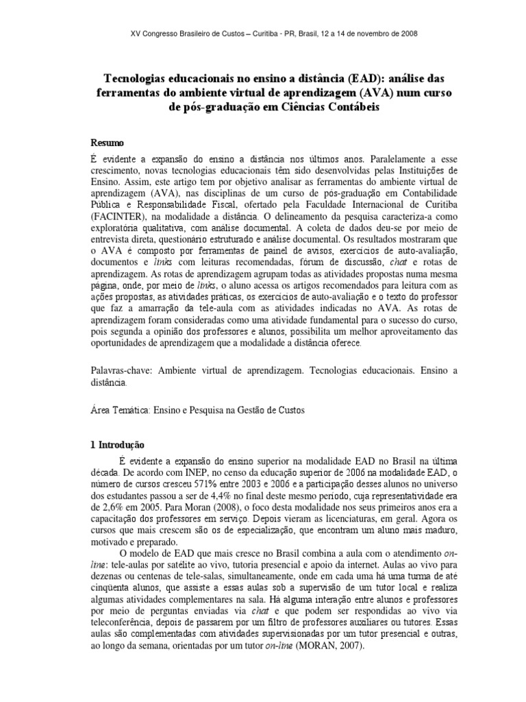 aprendizagem (AVA), nas disciplinas de um curso de ps-graduao em Contabilidade