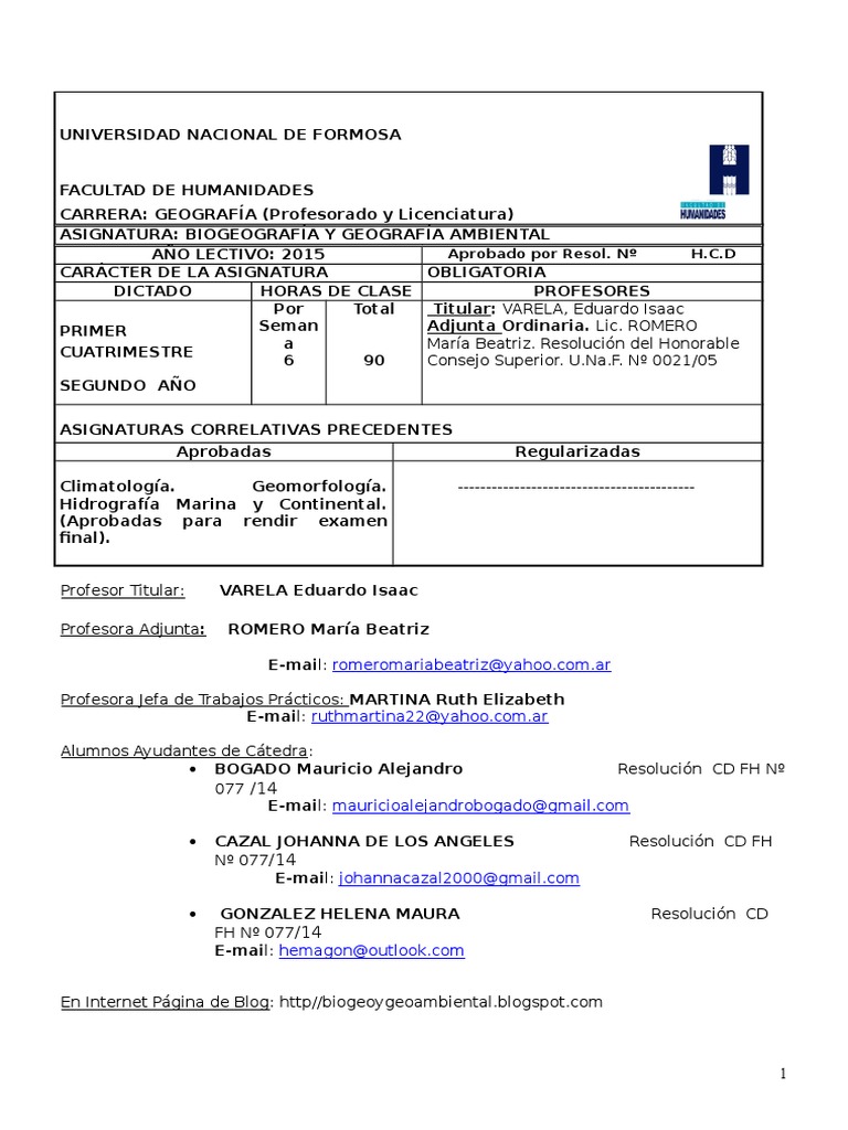 Ctedra de Biogeografa y Geografa Ambiental. Profesora Adjunta Ordinaria