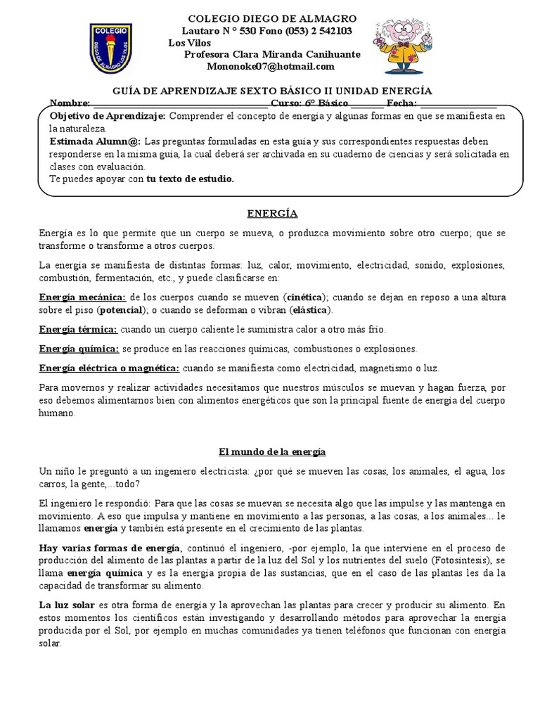Guía de Aprendizaje Sexto Básico II Unidad Energía