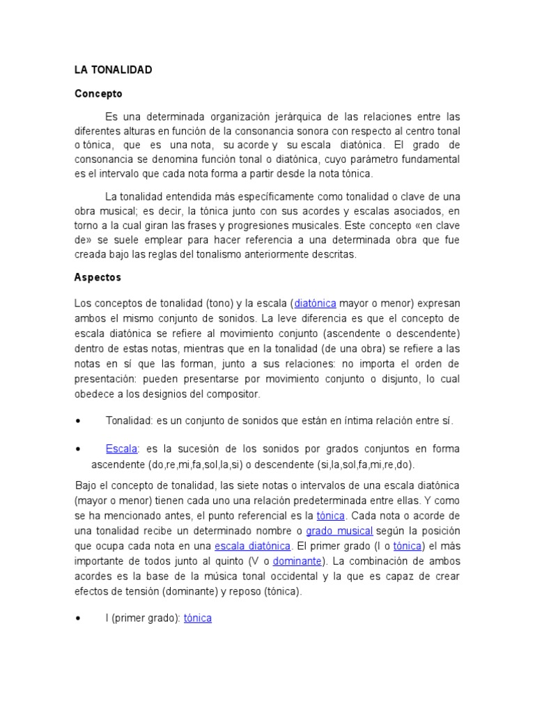 Los conceptos de tonalidad (tono) y la escala (diatnica mayor o menor) expresan