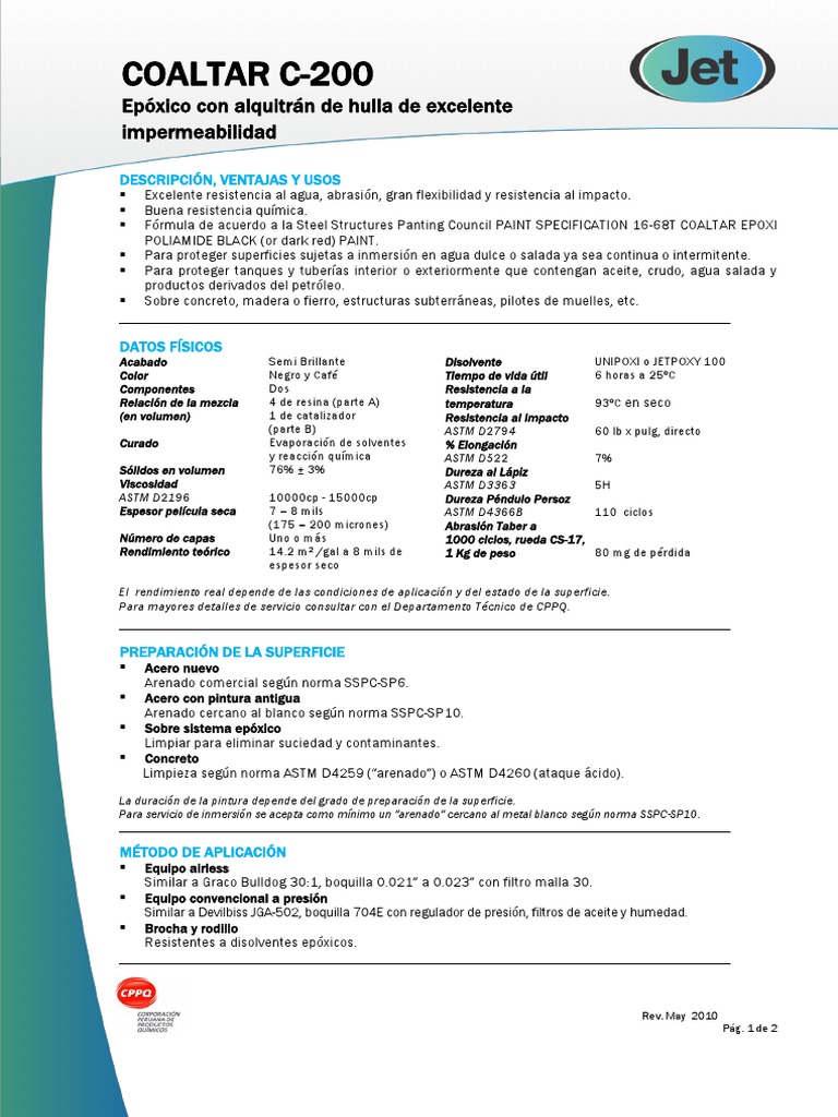 Frmula de acuerdo a la Steel Structures Panting Council PAINT SPECIFICATION 16-68T COALTAR EPOXI