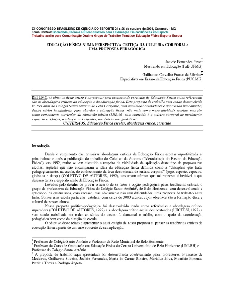 RESUMO: O objetivo deste artigo é apresentar uma proposta de currículo de Educação Física cujos referencias