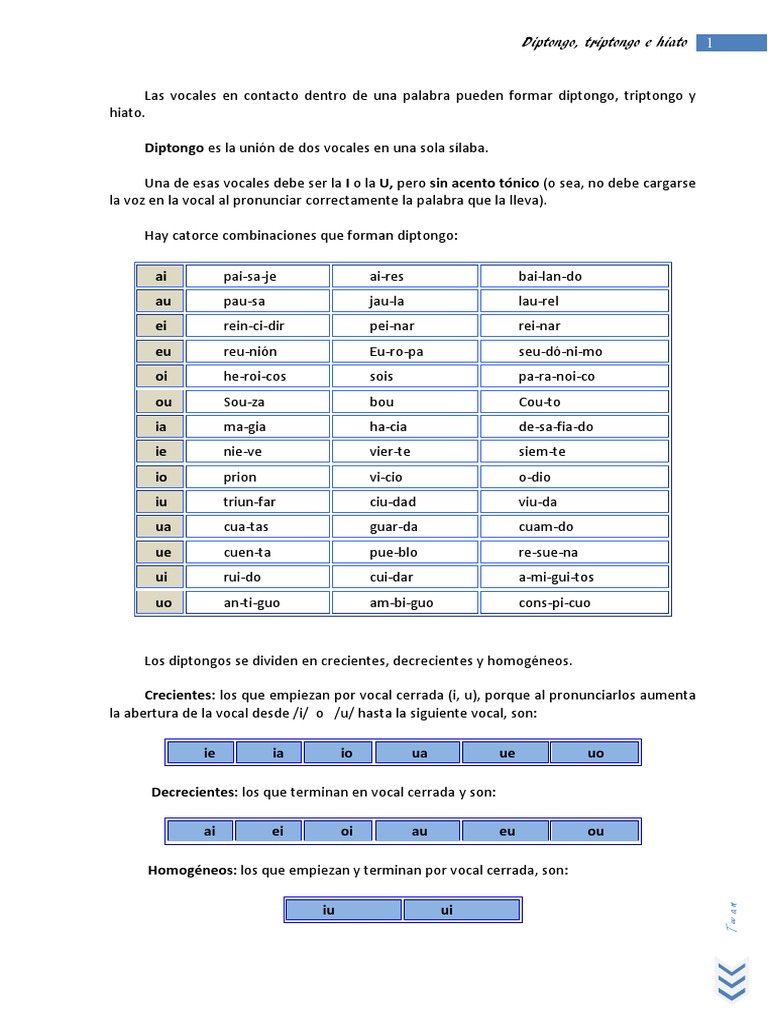 Los diptongos se dividen en crecientes, decrecientes y homogneos.