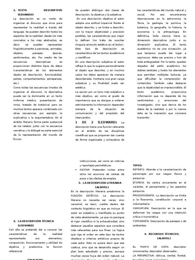 organizar el discurso), la descriptiva
