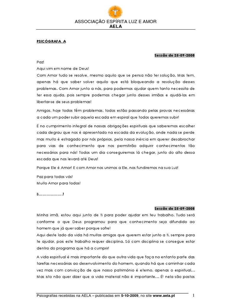 Psicografias recebidas na AELA publicadas em 5-10-2009, no site www.aela.pt