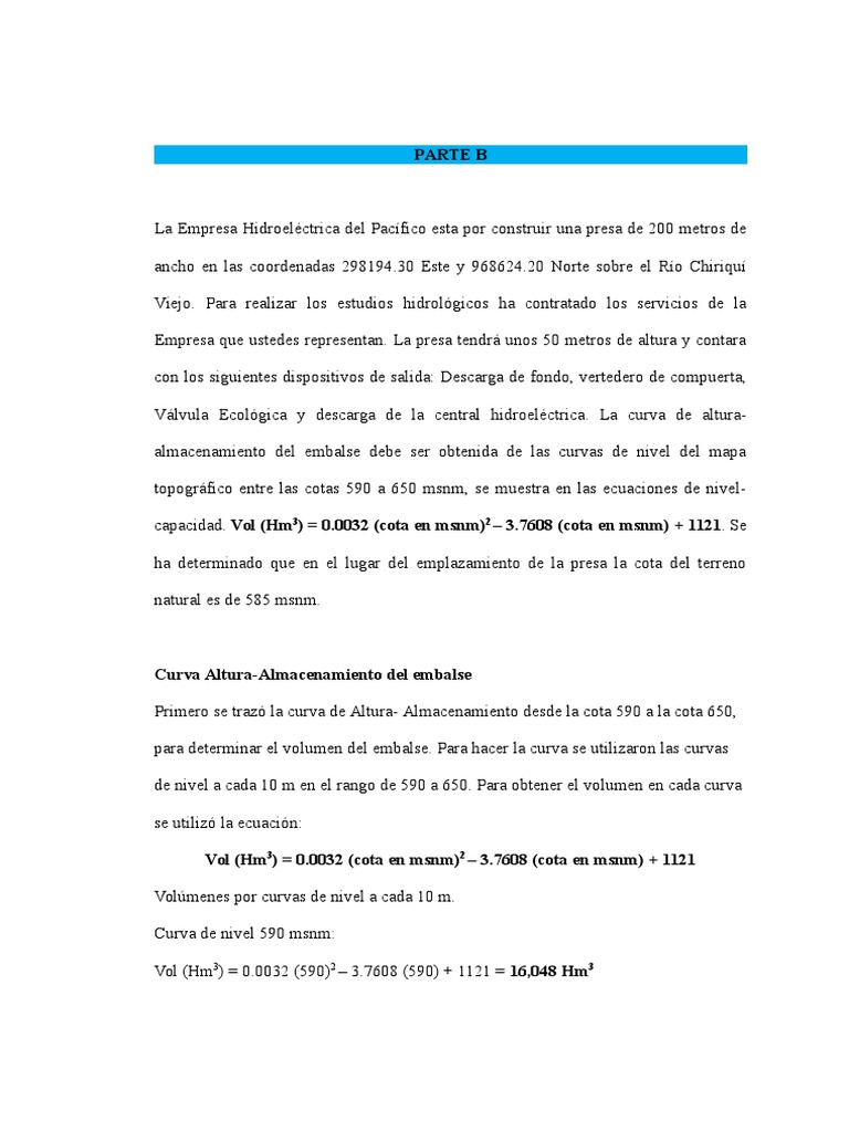 Vlvula Ecolgica y descarga de la central hidroelctrica. La curva de alturaalmacenamiento del embalse debe ser obtenida de las curvas de nivel del mapa