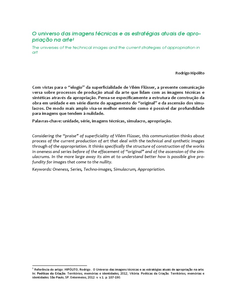 Referncia do artigo: HIPLITO, Rodrigo . O Universo das imagens tcnicas e as estratgias atuais de apropriao na arte.