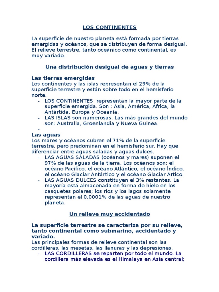 - LOS CONTINENTES representan la mayor parte de la