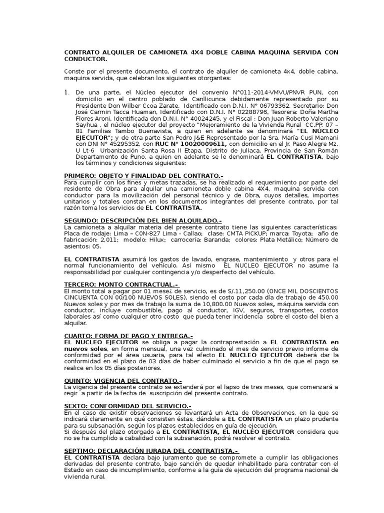 CONTRATO ALQUILER DE CAMIONETA 4X4 DOBLE CABINA MAQUINA SERVIDA CON