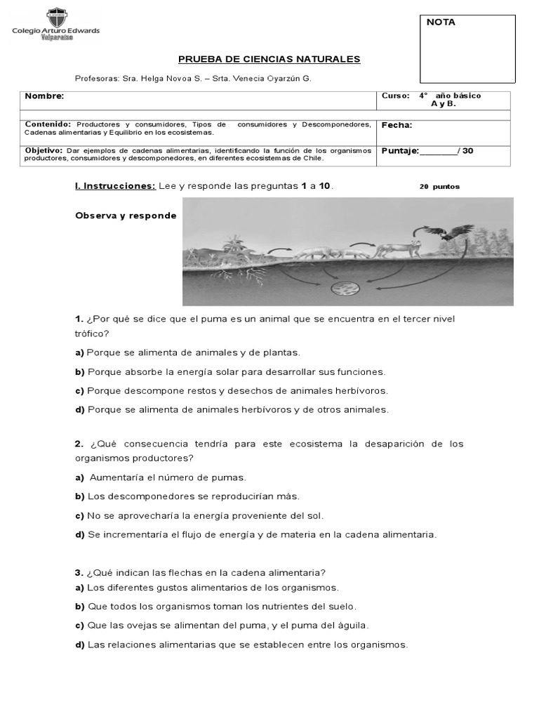 Prueba Ciencias Naturales. Cadenas Alimentarias - Cuarto