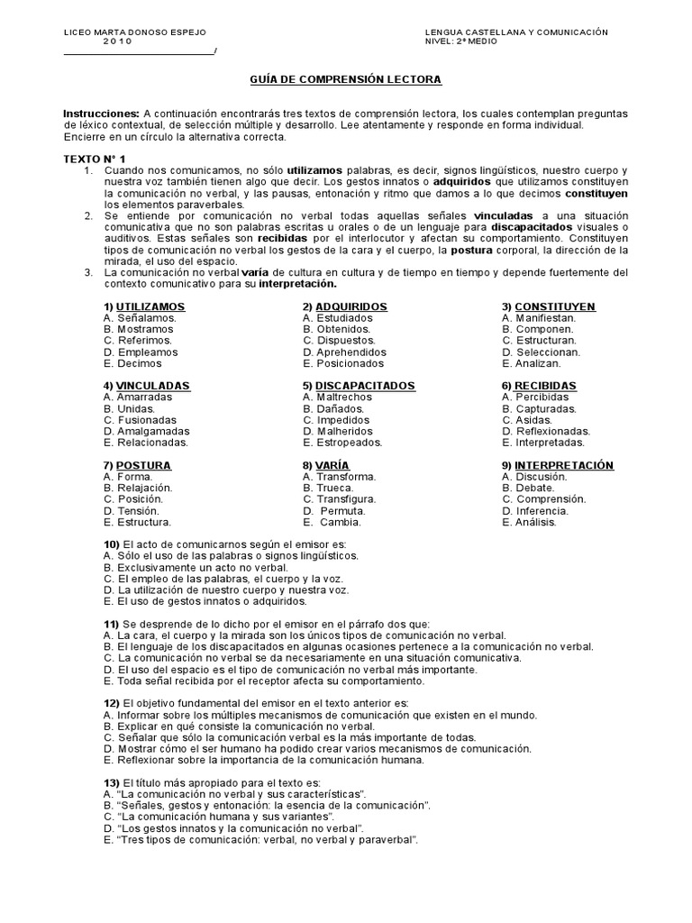 Instrucciones: A continuacin encontrars tres textos de comprensin lectora, los cuales contemplan preguntas