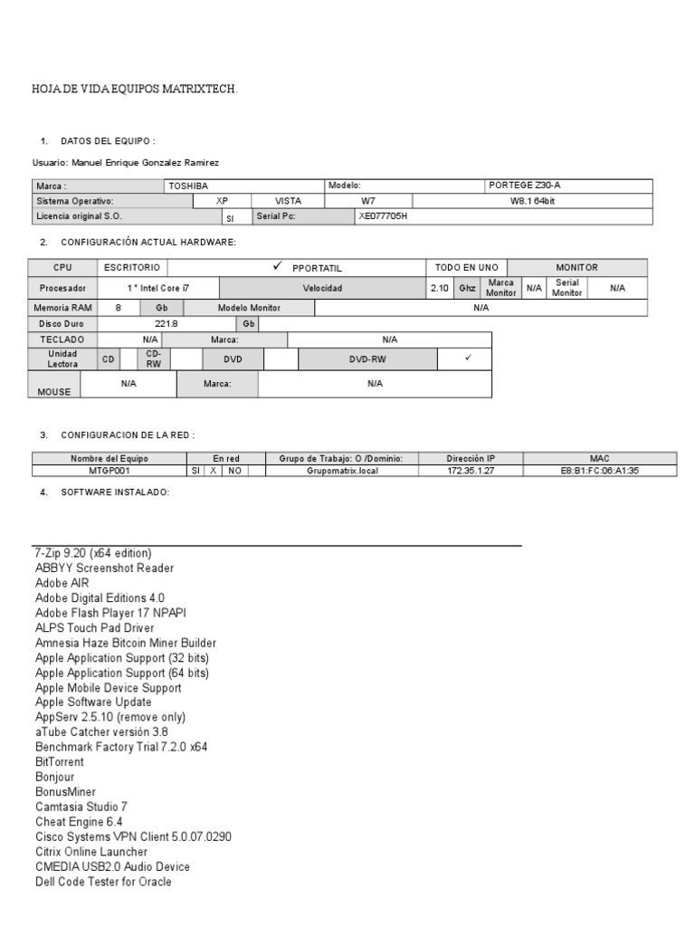 HOJA DE VIDA EQUIPOS MATRIXTECH.