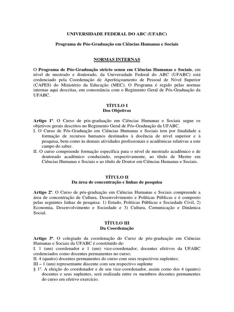 Artigo 1º. O Curso de pós-graduação em Ciências Humanas e Sociais segue os objetivos gerais descritos no Regimento Geral de Pós-Graduação da UFABC.