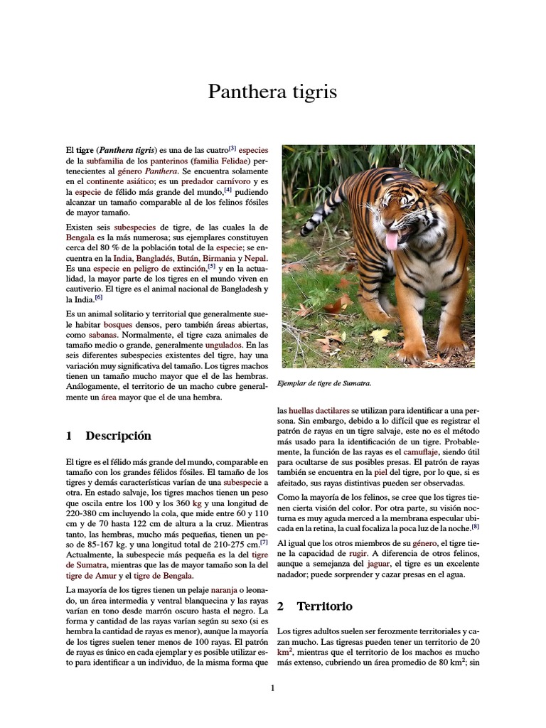 tanto, las hembras, mucho ms pequeas, tienen un peso de 85-167 kg. y una longitud total de 210-275 cm.[7] Al igual que los otros miembros de su gnero, el tigre tieActualmente, la subespecie ms pequea es la del tigre ne la capacidad de rugir. A diferencia de otros felinos,