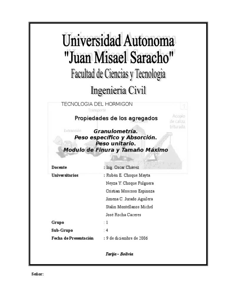 de Hormign, realizad en base a estudios de: Granulometra, Peso Especifico y Absorcin, Peso