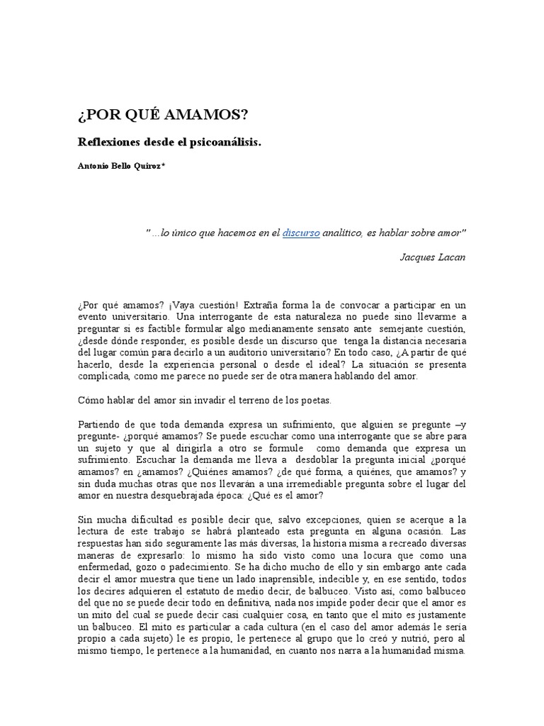 discurso que se plantee desde su origen cuestionarse sobre el amor; el psicoanlisis