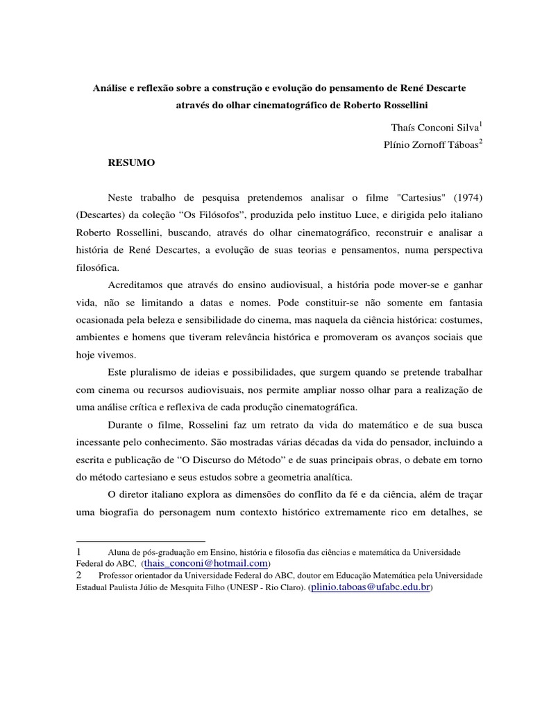 Neste trabalho de pesquisa pretendemos analisar o filme "Cartesius" (1974)