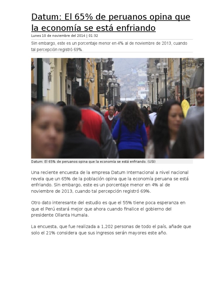 Datum: El 65% de peruanos opina que la economa se est enfriando. (USI)