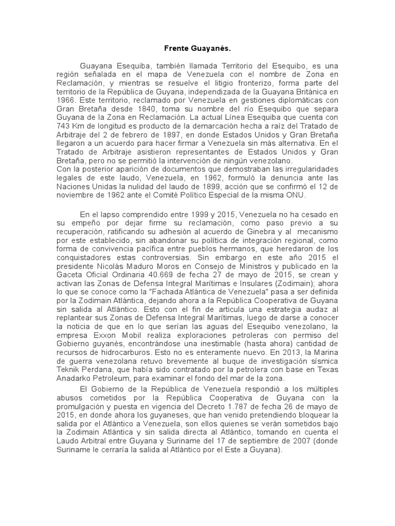 Venezuela has repeatedly contested the legal validity of the 1899 Arbitral Award. In 1962, this culminated in a formal denunciation at the United Nations, asserting that the award was procured through flawed proceedings without Venezuelan representation. Venezuela sought to address these grievances through the 1966 Geneva Agreement, which established mechanisms for negotiating a peaceful resolution between the parties. In recent years, Venezuela has employed strategic geopolitical maneuvers, such as redefining maritime boundaries through the Zodimain Atlántica in 2015 to reinforce its claims. These actions reflect a long-term legal and diplomatic strategy to overturn or mitigate the award's impacts, although the core issue remains unresolved due to entrenched positions by both Venezuela and Guyana .