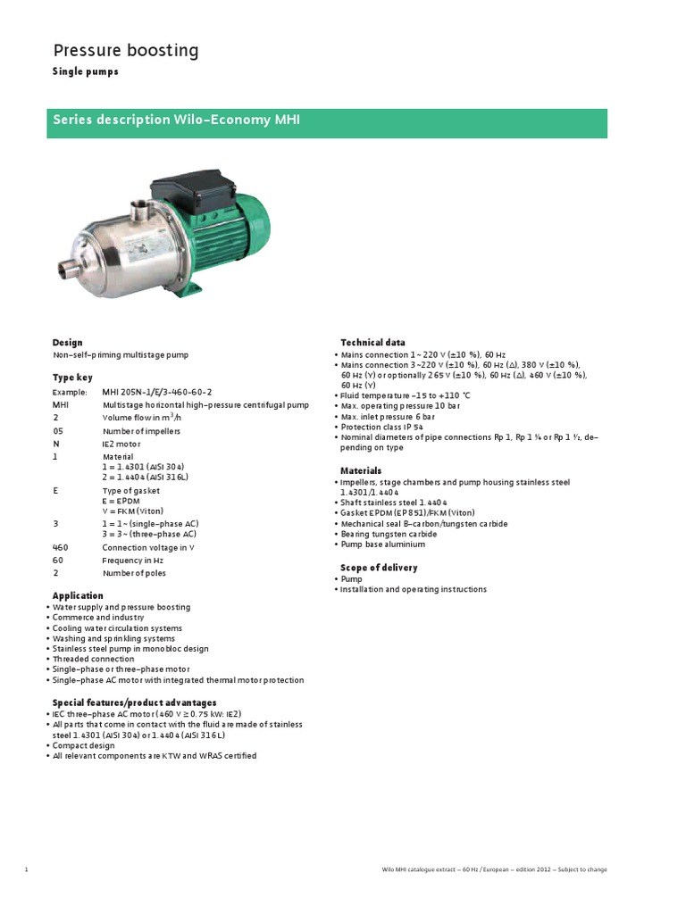 Wilo MHI catalogue extract 60 Hz / European edition 2012 Subject to change