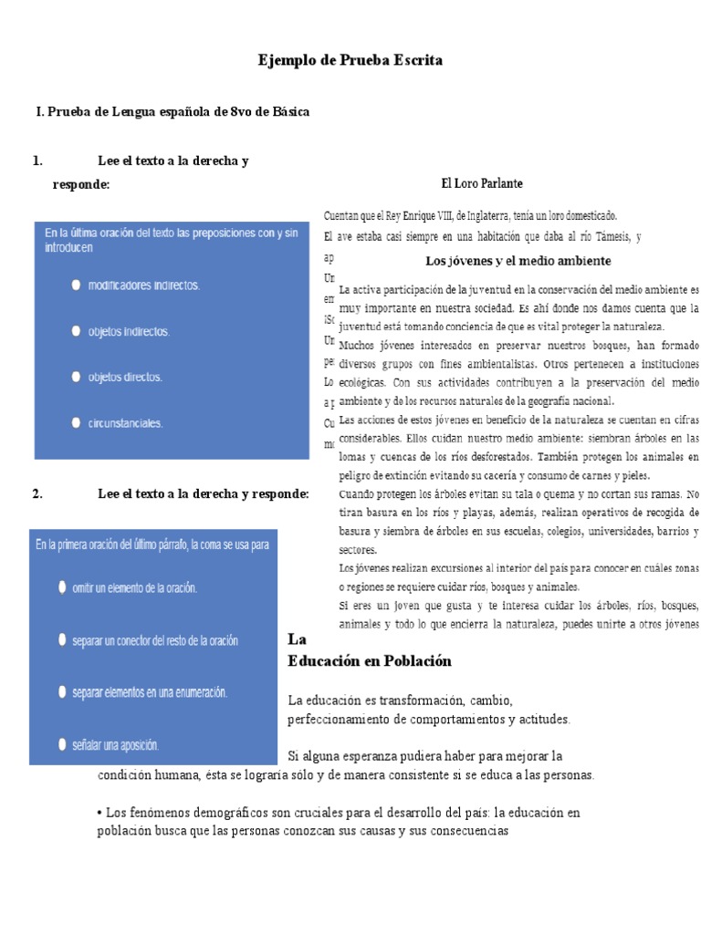 I. Prueba de Lengua espaola de 8vo de Bsica