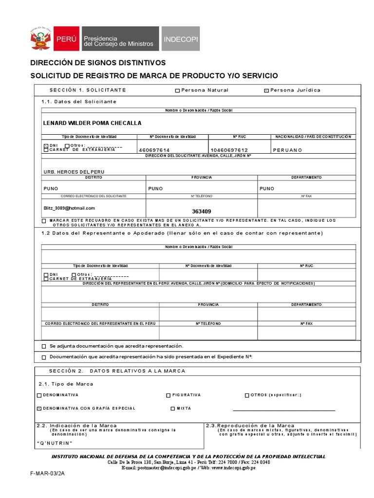 SOLICITUD DE REGISTRO DE MARCA DE PRODUCTO Y/O SERVICIO