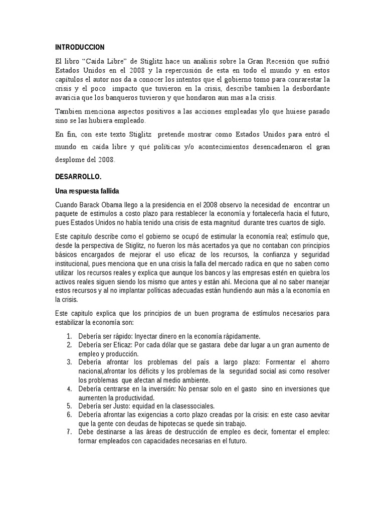 El libro Cada Libre de Stiglitz hace un anlisis sobre la Gran Recesin que sufri