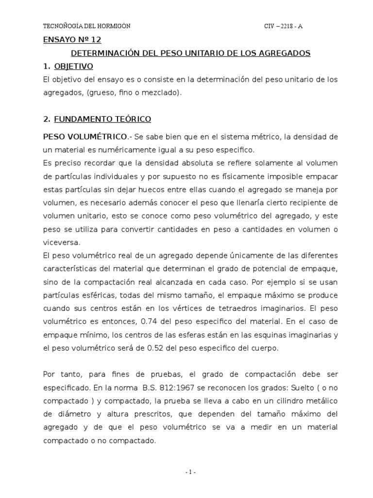 El objetivo del ensayo es o consiste en la determinacin del peso unitario de los
