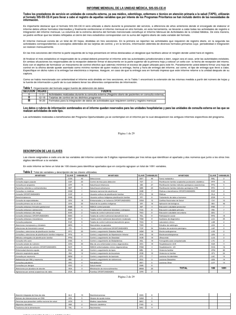 El Informe mensual consta de un total de 20 hojas, divididas en tres secciones. En la primera se reportan las actividades que requieren de registro diario, en la segunda las
