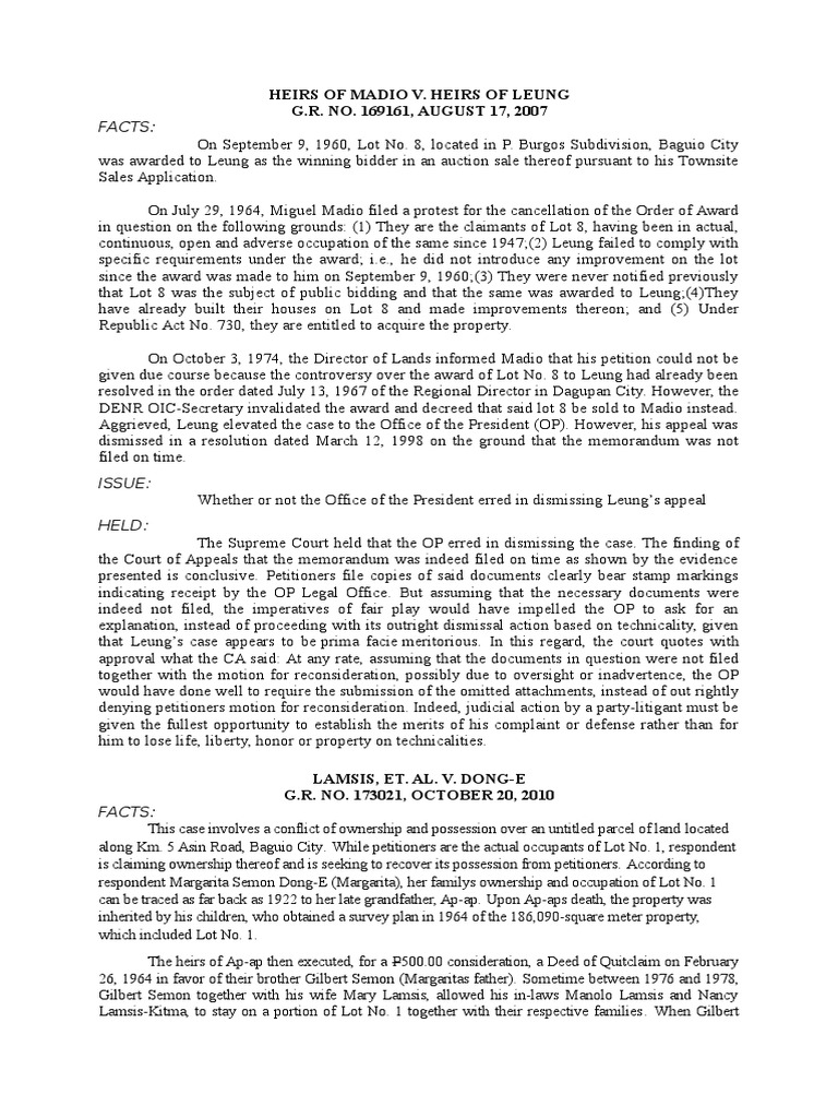 Inc. Bockasanjo ISF Awardes Association. and Regalian Doctrine.application was the technical description of the lot signed by the Bureau of Lands. 129. even the survey they petitioners presented stated that the lot is within the MWR... does not have a registrable title over the lot. Firstly because since 1904. Petitioners also alleged that there have been nine transfers of rights since then and that there are twenty-five coowners. unless the occupant can prove possession and occupation of the same under claim of ownership for the required number of years to constitute a grant from the State. EO 33 established the Marikina Watershed Reservation (MWR) in Rizal. was only in possession of the lot for 2 years prior the issuance of EO 33. however long the period may have extended. ISSUE: Whether or not Collado et al. The application included a survey which stated that the lot is inside IN-2 Marikina Watershed. the land registration court issued an order of general default against the whole world with the exception of the oppositors. the lots within the MWR remain to this day as inalienable properties of the State. notorious and in the concept of owners and that they have declared the lot for taxation purposes and have paid all the corresponding real estate taxes. 67 of the Water Code if the Philippines (PD 1607). This is bereft of merit because mere possession by private individuals of lands does not create the legal presumption that the lands are alienable and disposable because Regalian Doctrine dictates that. there had been no clear showing that the lot had been previously classified as alienable and disposable. notorious and continuous possession in the concept of owner since 1902. The petitioner cannot use the saving clause in EO 33 because they don’t have documentary title over the lot and that they have failed to acquire a valid enforceable right or title because of the failure to complete the required period of possession whether under CA 141 or under any of its amendments because their predecessor-in-interest. The Republic through the Solicitor General filed its opposition to the application of Collado et al.. Republic appealed to the Court of Appeals for annulment of the decision on the ground that pursuant to section 9(2) of BP Blg. if any there be. filed with Court of Appeals their intervention stating that the lot in dispute is alienable and alleged that they are the actual occupants of the Lot pursuant to the certificates of stewardship issued by the DENR under the ISF tree planting purposes.. have a registrable title over the lot HELD: Supreme Court ruled that Collado et al. public. in the course of the hearing before the Land Registration Court. However. never confers title thereto upon the possessor because the statute of limitations with regard to public land does not operate against the State. the Republic failed to appear despite notices. . as there are no other oppositors. A watershed reservation is a natural resource and because of its importance and following the provisions Art. The petitioners alleged that their possession have been open. The possession of public land. based on the evidence and testimonies presented by Collado et al. Sesinado Leyva. Period of occupancy after EO 33 could no longer be counted because it was then inalienable. An order was issued the Land Regulation Authority to issue corresponding decree of registration in favor of the petitioners.. all lands not otherwise appearing clearly within private ownership are presumed to belong to the State. The contention of the petitioners was that the EO 33 contained a saving clause that the reservation was subject to private rights. The Land Registration Court. Petitioners trace their possession from Sesinado Leyva who was in open. ruled in favor of petitioners.