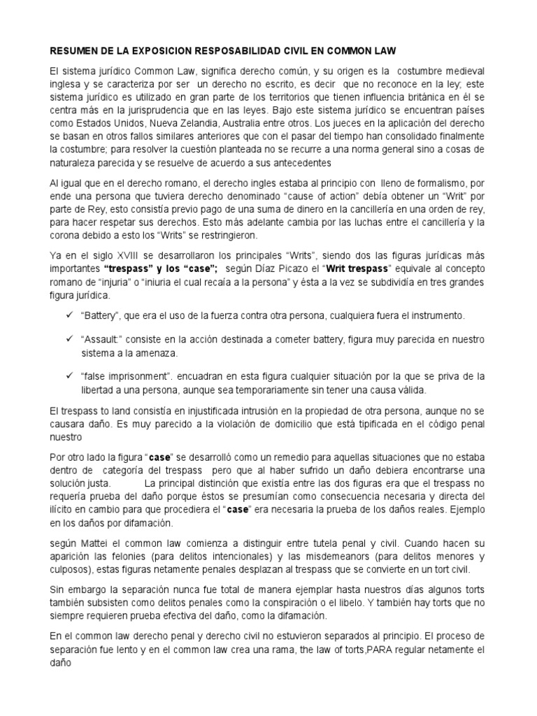 RESUMEN DE LA EXPOSICION RESPOSABILIDAD CIVIL EN COMMON LAW