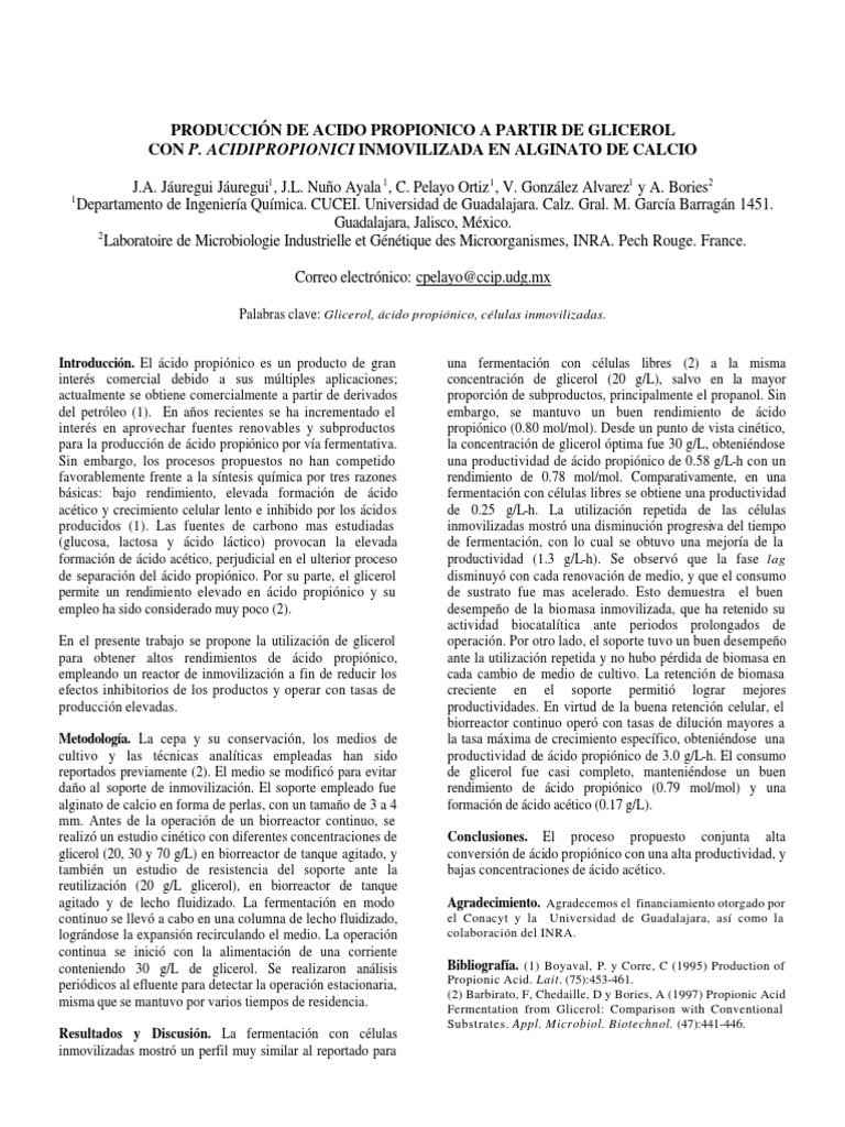 Palabras clave: Glicerol, cido propinico, clulas inmovilizadas.