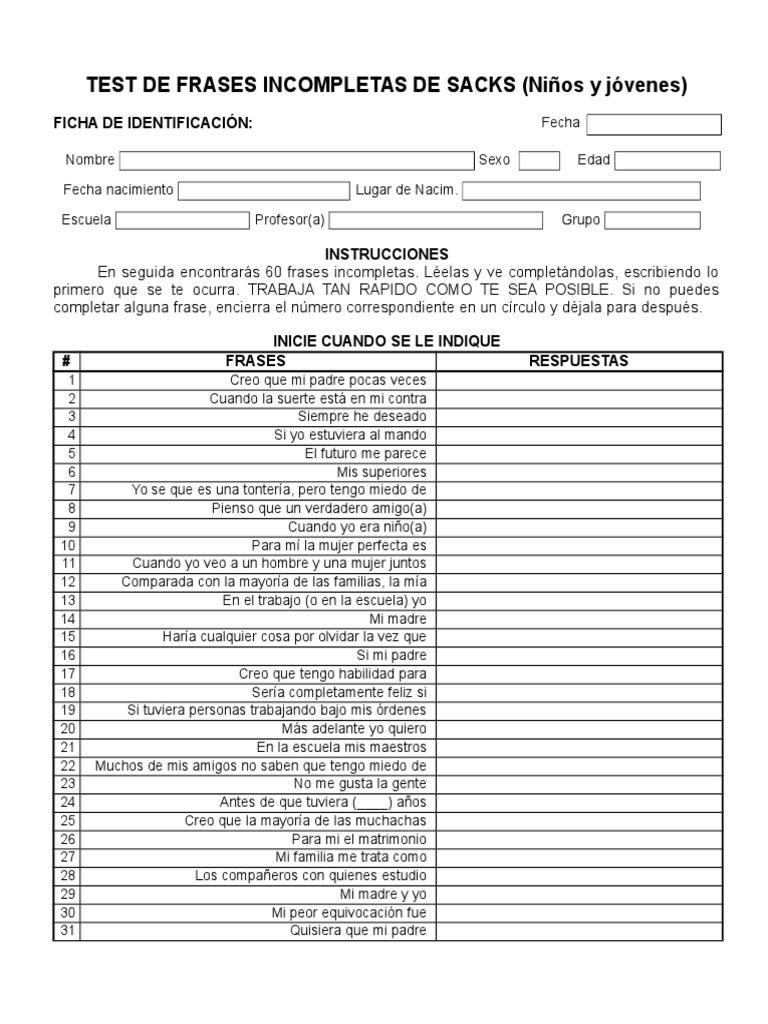 TEST DE FRASES INCOMPLETAS DE SACKS (Nios y jvenes)