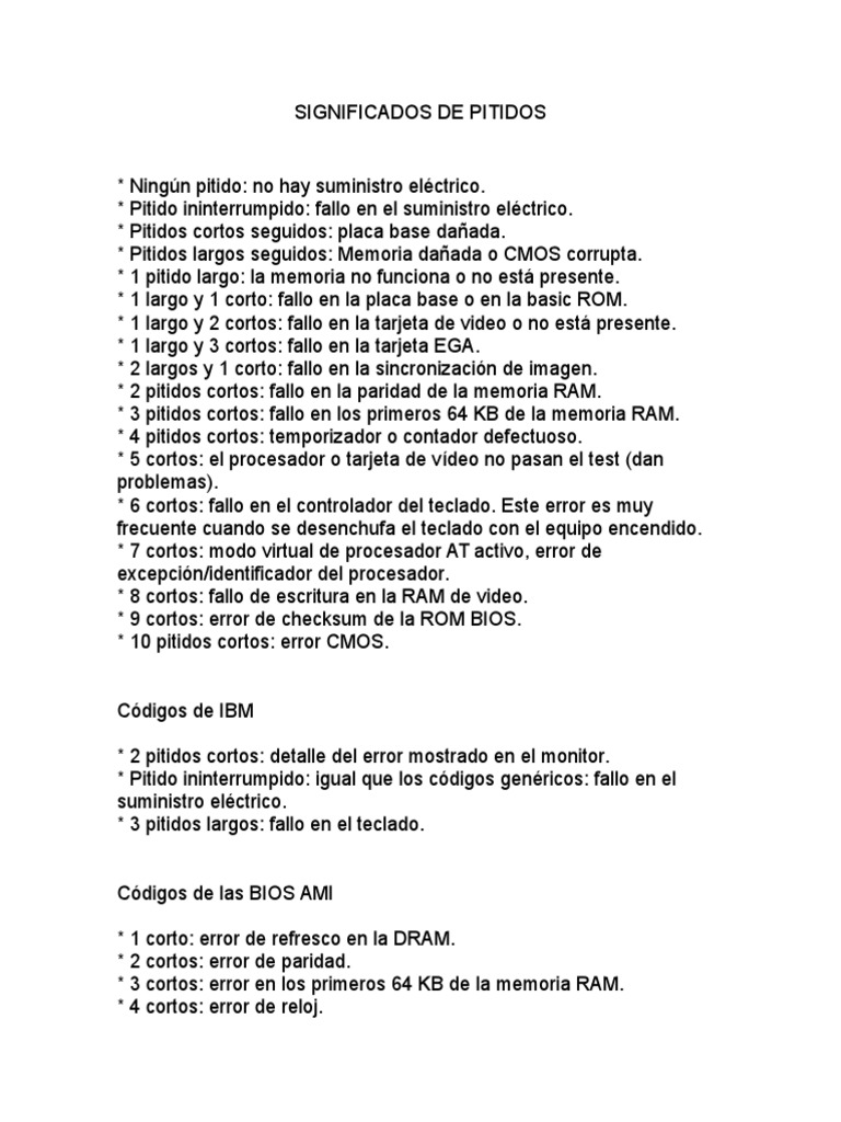 * 1 largo y 2 cortos: fallo en la tarjeta de video o no est presente.