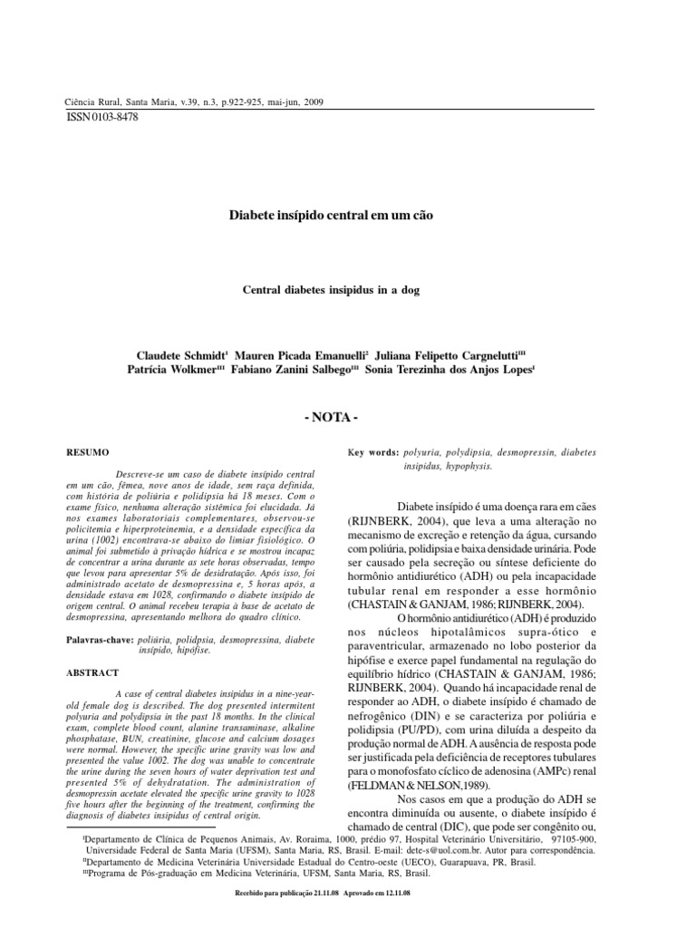 de DIC é firmado, a terapia deve ser baseada na reposição do ADH ou manter o animal com acesso livre à água (LUNDIN & VILHARDT, 1986; HARB et al., 1996; FUKUDA et al., 2003). Devido à importância de diagnosticar e diferenciar o diabete insípido de outras enfermidades que cursam com PU/PD, o objetivo neste trabalho é de descrever um caso de DIC. Foi atendida no Hospital Veterinário Universitário da Universidade Federal de Santa Maria (RS), um cão, fêmea, castrada, sem raça definida, de 9 anos de idade, com histórico de ingestão excessiva de água e volume urinário aumentado há 18 meses. Segundo a proprietária, o animal chegava a ingerir cinco litros de água em 24 horas, apresentava noctúria, ocasionalmente urinava até mesmo deitada e demonstrava inquietude extrema quando privada da ingestão hídrica. O animal não apresentava qualquer alteração ao exame físico. Foram realizados hemograma, urinálise, determinação de proteínas totais, glicose, uréia, creatinina, fosfatase alcalina, alanina aminotransferase, colesterol e cálcio séricos. No hemograma evidenciou-se policitemia e hiperproteinemia. Na urinálise, observou-se apenas densidade urinária de 1002, sem presença de outras alterações químicas e sedimentoscópicas. Os demais exames complementares apresentaram resultados dentro dos parâmetros normais. No dia posterior ao atendimento, o animal foi submetido ao teste de privação hídrica. Foi colhida urina e monitorado o peso da paciente no momento da chegada e a cada hora, totalizando sete amostras até que se constatasse a perda de 5% do peso corporal. A cada hora que o animal era pesado e levado para urinar, houve micção espontânea com urina clara e abundante. A densidade específica da urina (DEU) se manteve dentro da faixa de hipostenúria, no valor de 1002 até a última colheita. Após, foi administrado acetato de desmopressina (DDAVP), na dose de 4 μ g, por via intramuscular e colhidas cinco amostras de urina com intervalo de uma hora entre as colheitas. Após três horas da administração do ADH, houve aumento da densidade urinária (de 1002 a 1028), sendo que essa permaneceu dentro da faixa de normalidade decorridas cinco horas. Ainda mais, houve redução do volume urinário e a urina se mostrou mais amarelada, possibilitando o diagnóstico de DIC. O diabete insípido é caracterizado por PU/ PD sem outros sinais clínicos indicadores de enfermidade sistêmica (CHASTAIN & GANJAM, 1986; AUTHEMENT et al., 1989; POST et al., 1989; FELDMAN & NELSON, 1989; HARB et al., 1996; RIJNBERK, 2004), podendo ser adquirido ou secundário em animais adultos (CHASTAIN &