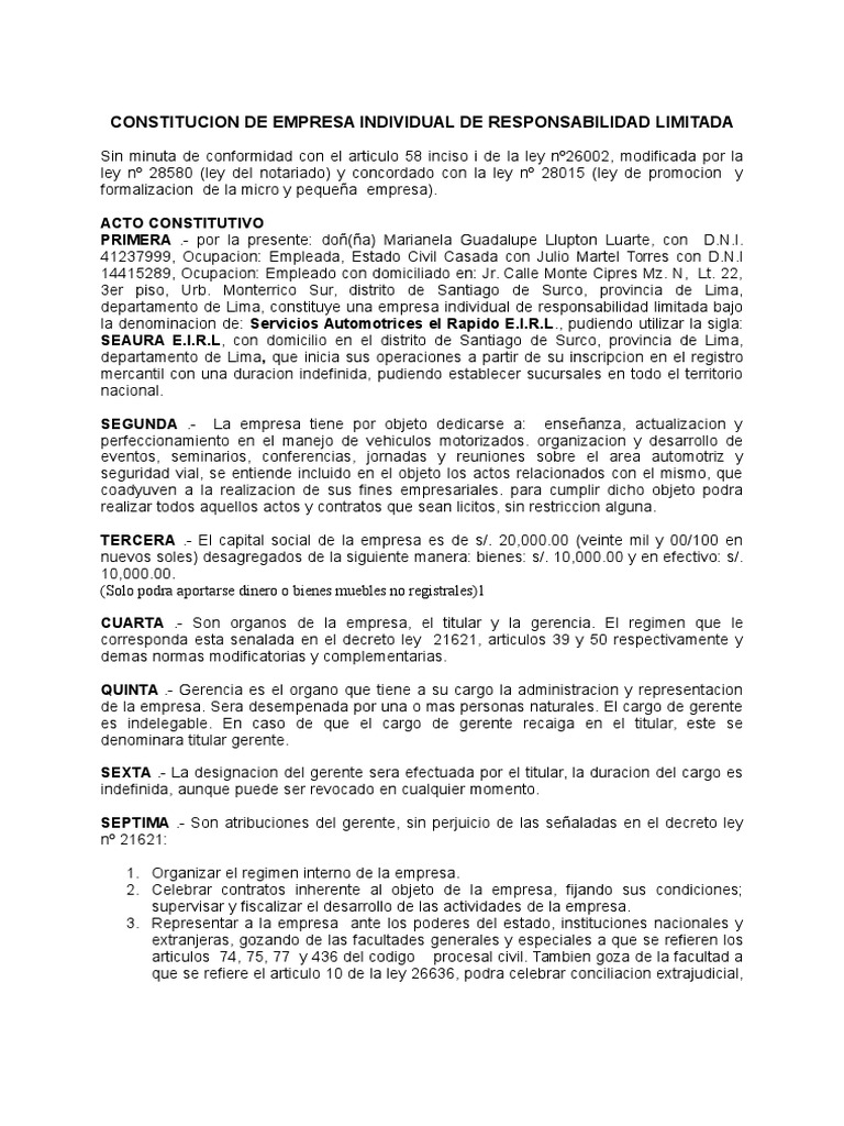 CONSTITUCION DE EMPRESA INDIVIDUAL DE RESPONSABILIDAD LIMITADA