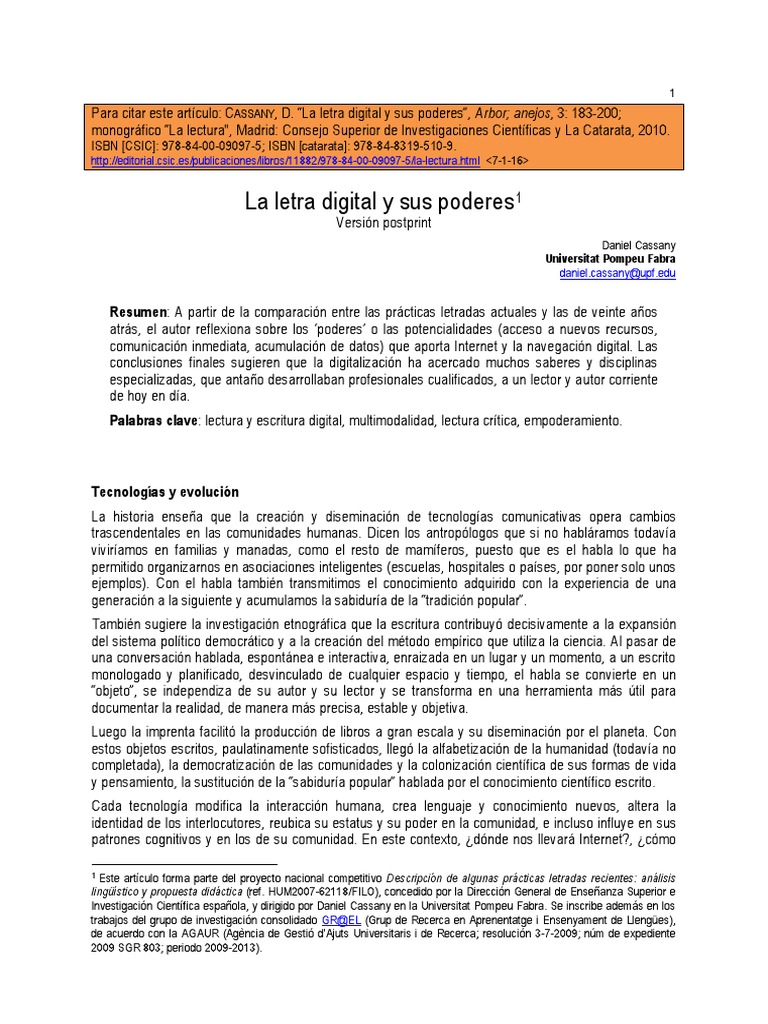 Para citar este artculo: CASSANY, D. La letra digital y sus poderes, Arbor; anejos, 3: 183-200;