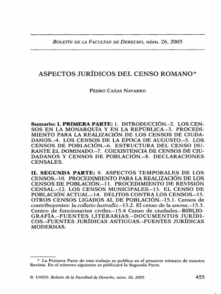 Sumario: I. PRIMERA PARTE: 1. INTR0DUCCIN.-2. LOS CENSOS EN LA MONARQUA Y EN LA REPBLICA.-3. PROCEDIMIENTO PARA LA REALIZACIN DE LOS CENSOS DE CIUDADAN0S.-4. LOS CENSOS DE LA POCA DE AUGUST0.-5. LOS