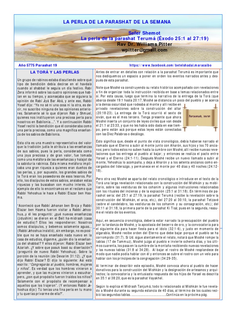 con los rituales del incienso y de la expiacin (25:1 al 31:18). En trminos de parashot sera: del 25:1 al 27:19, la parashat Terum (recibe la revelacin sobre la